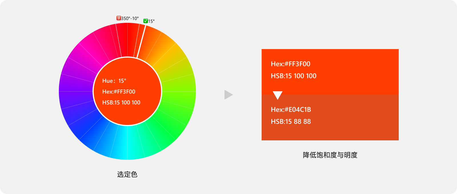 同时我将最终选取的颜色(HUE15°)进行了饱和度亮度降低,以确保最终应用在界面设计得到更加舒适的视觉观感。